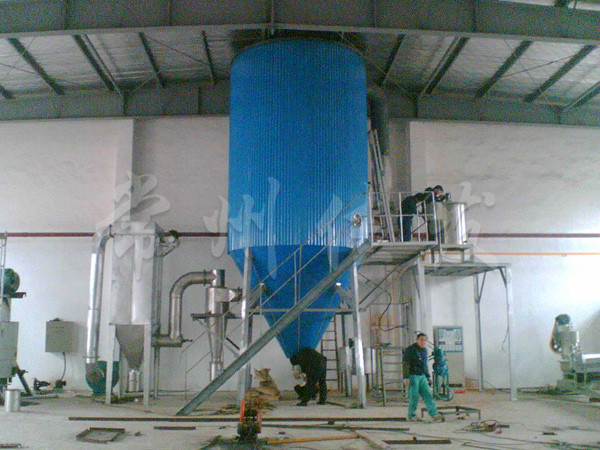 本機(jī)是將料液壓入壓力噴嘴霧化成微小霧滴,在塔內(nèi)與熱風(fēng)以對流的方式完成干燥,獲得顆粒產(chǎn)品。