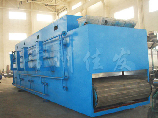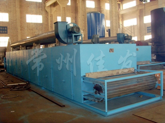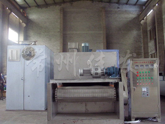 物料由加料器均勻地鋪在網(wǎng)帶上,網(wǎng)帶一般采用12-60目不銹鋼絲網(wǎng),由傳動(dòng)裝置拖動(dòng)在干燥機(jī)內(nèi)移動(dòng)。干燥機(jī)由若干單元組成,每一單元熱風(fēng)獨(dú)立循環(huán),部分尾氣由專門濕風(fēng)機(jī)排出,廢氣由調(diào)節(jié)閥控制,熱氣由下往上或由上往下穿過鋪滿物料的網(wǎng)帶完成熱量與質(zhì)量傳遞的進(jìn)程,帶走物料的水份。網(wǎng)帶緩慢移動(dòng),運(yùn)行速度可根據(jù)物料溫度自動(dòng)調(diào)節(jié),干燥后的成品連續(xù)落入收料器中。上下循環(huán)單元根據(jù)用戶需要可靈活配備,單元數(shù)量亦可根據(jù)需要選取。