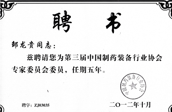 制藥裝備協(xié)會專家委員聘書